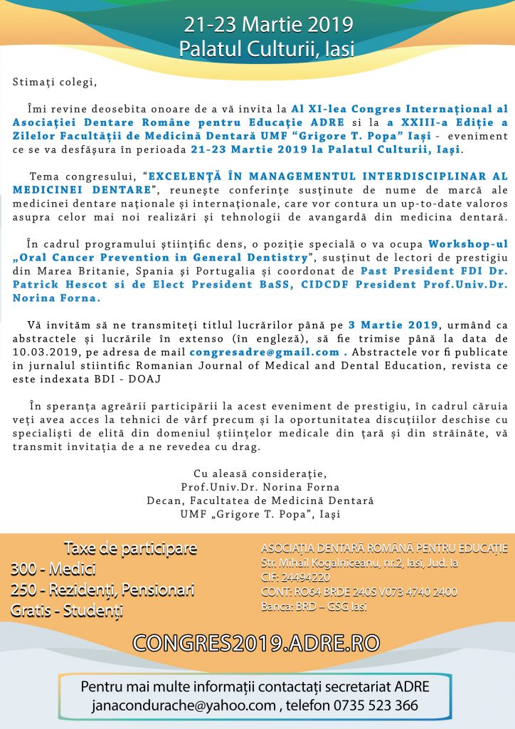Îmi revine deosebita onoare de a vă invita la Al XI-lea Congres Internaţional al Asociaţiei Dentare Române pentru Educaţie ADRE si la a XXIII-a Ediție a Zilelor Facultății de Medicină Dentară UMF “Grigore T. Popa” Iași – eveniment ce se va desfăşura în perioada 21-23 Martie 2019 la Palatul Culturii, Iaşi.